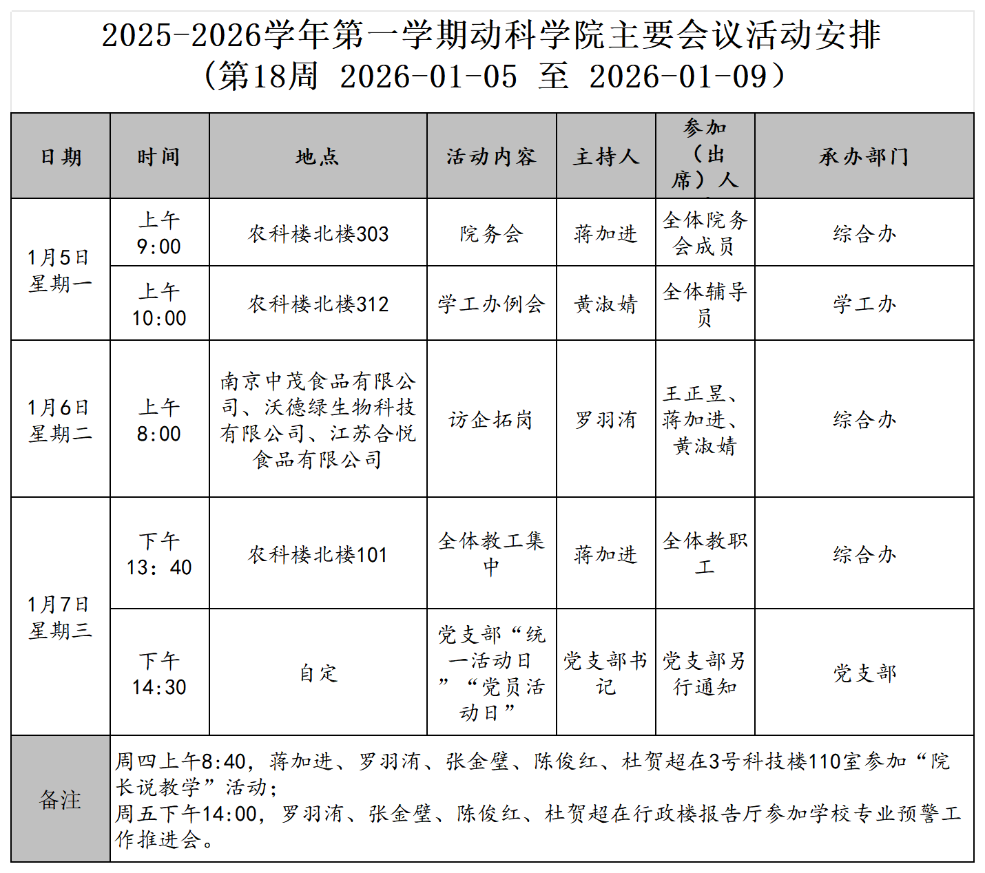 2025-2026学年第一学期第十八周动科学院主要会议活动安排