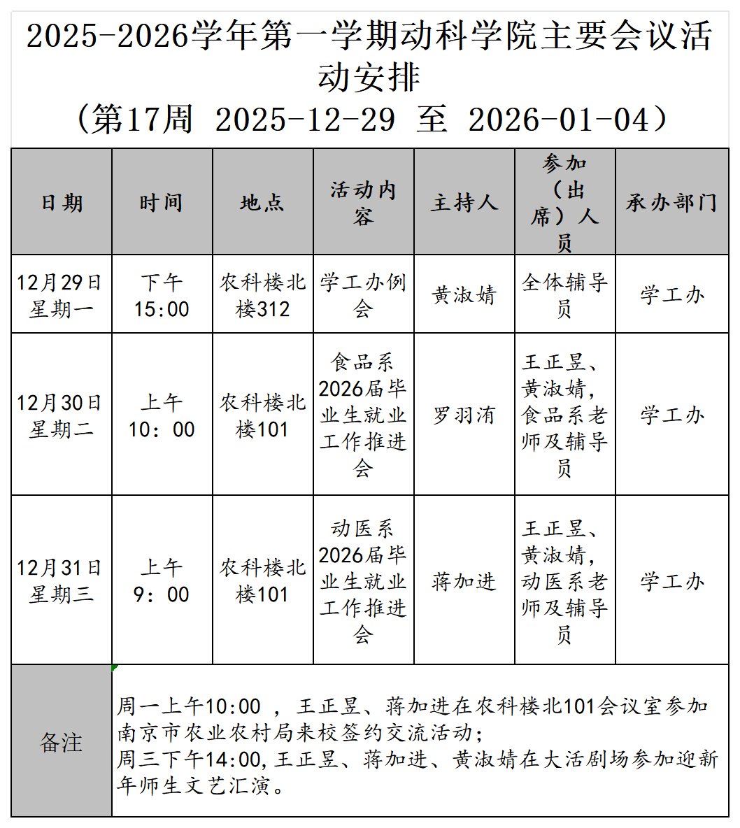 2025-2026学年第一学期第十七周动科学院主要会议活动安排