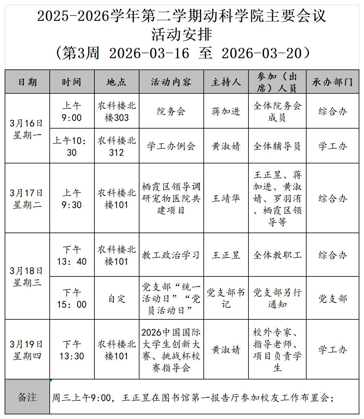 2025-2026学年第二学期第三周动科学院主要会议活动安排