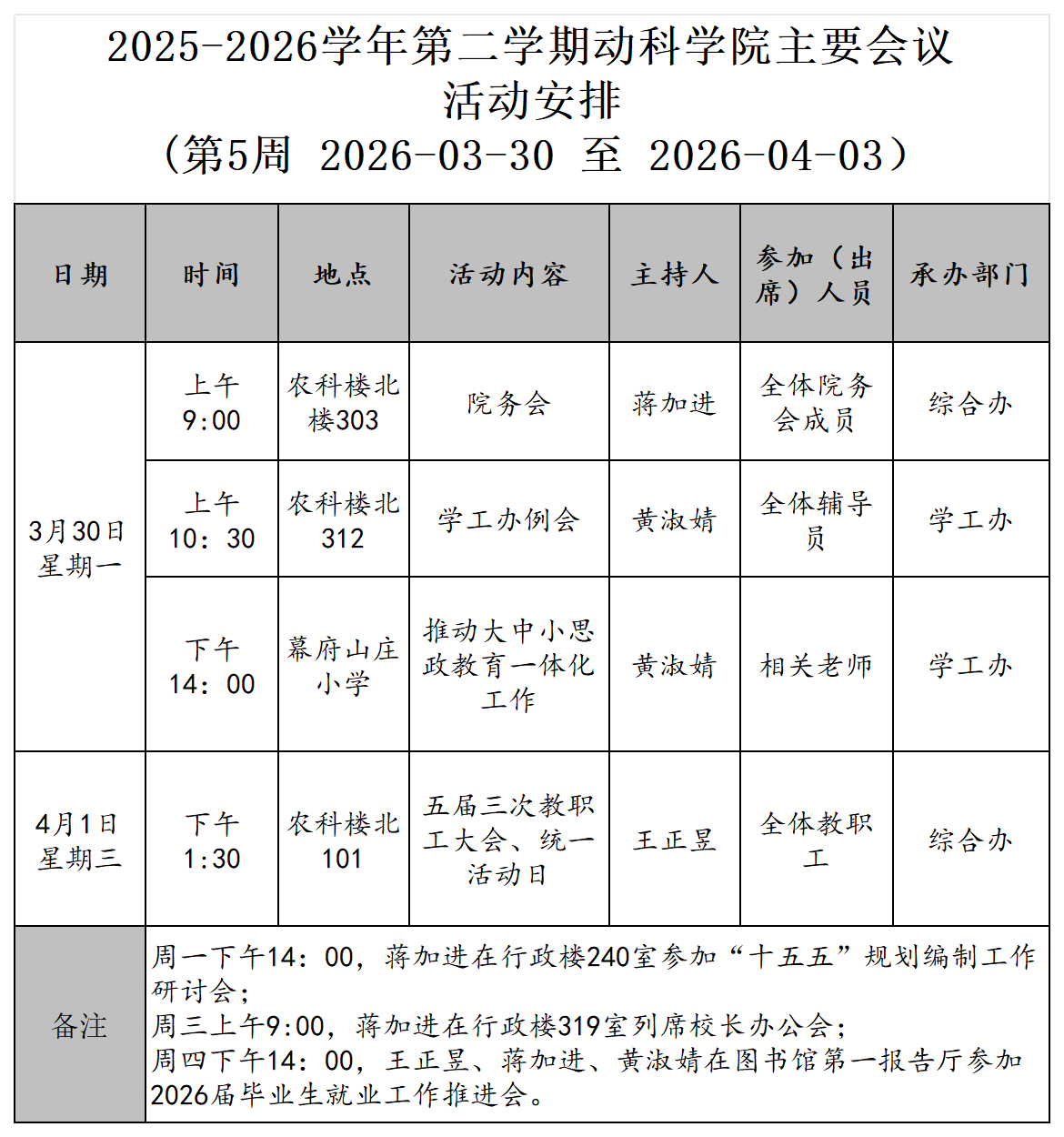 2025-2026学年第二学期第五周动科学院主要会议活动安排