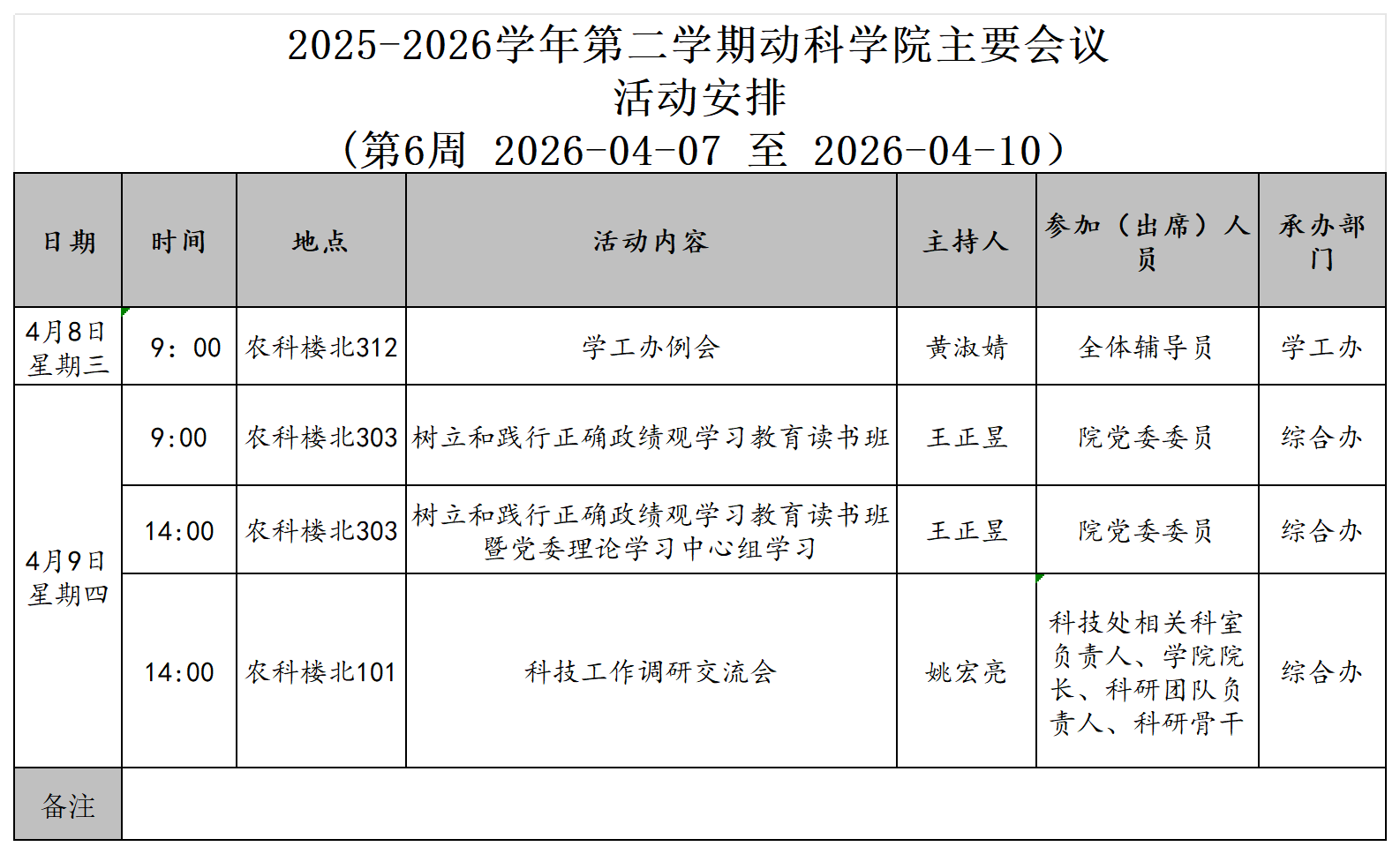 2025-2026学年第二学期第六周动科学院主要会议活动安排