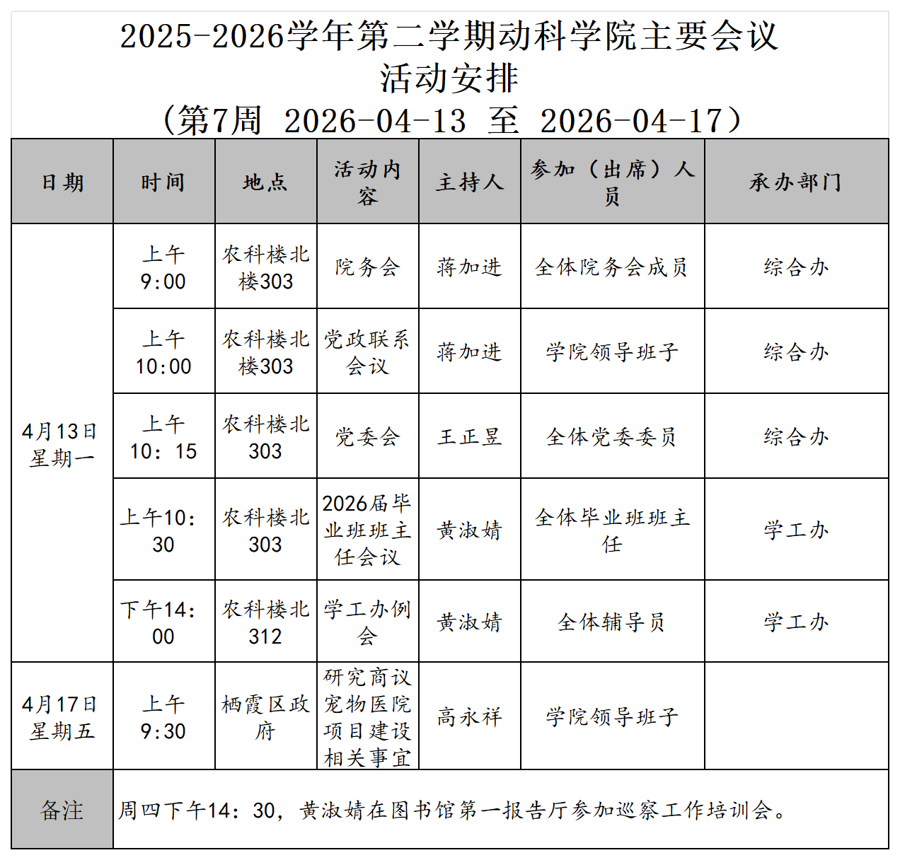 2025-2026学年第二学期第七周动科学院主要会议活动安排