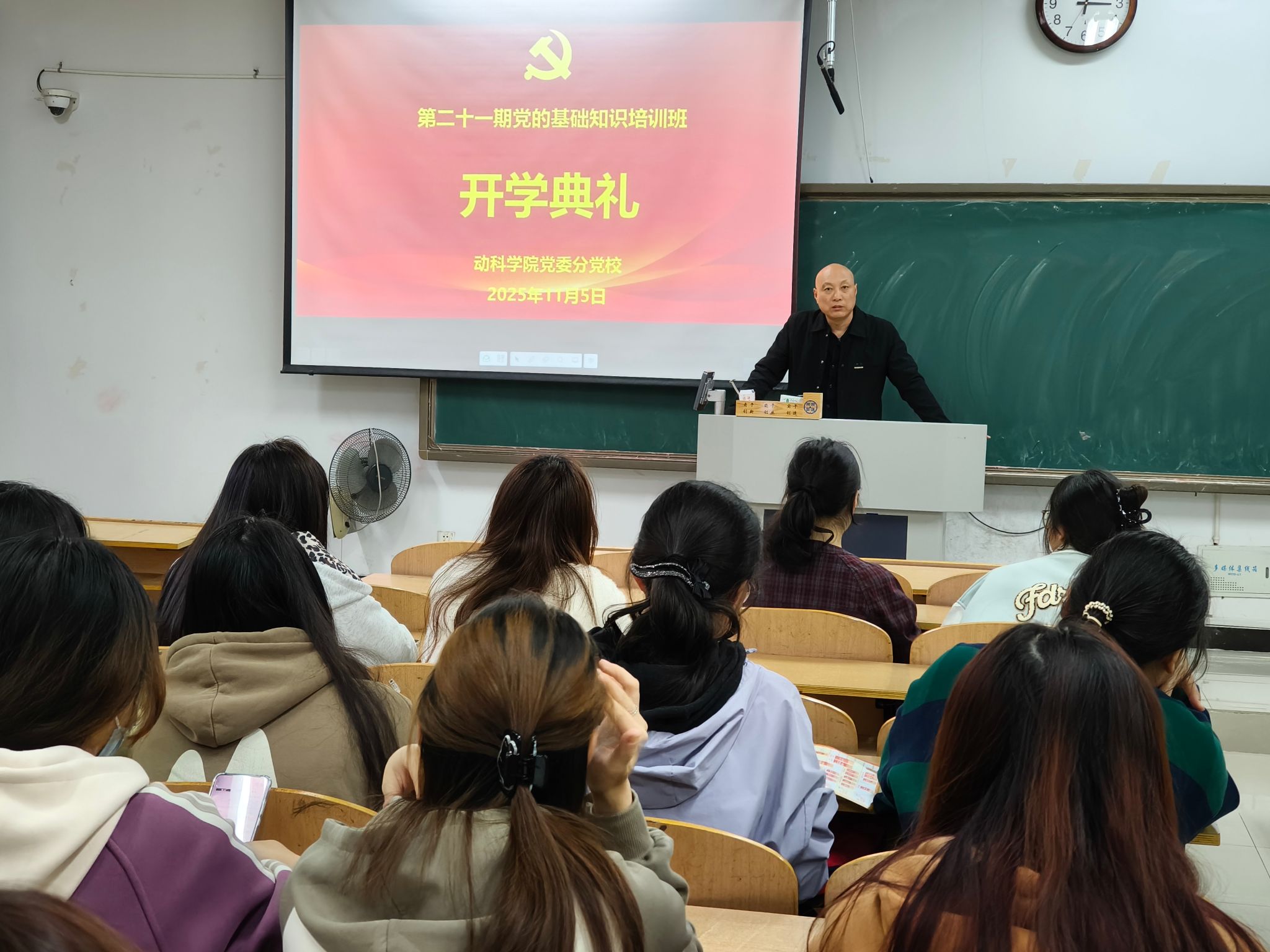 2025年11月5日下午,动物科学与食品工程学院分党校在图教楼b202教室顺利举办第21期党的基础知识培训班开班典礼。本次培训旨在增进青年学生对党的基本理论、基本路线和基本方略的理解,引导同学们端正入党动机,坚定理想信念。学院党委书记王正昱、组织员葛佳琦出席会议。